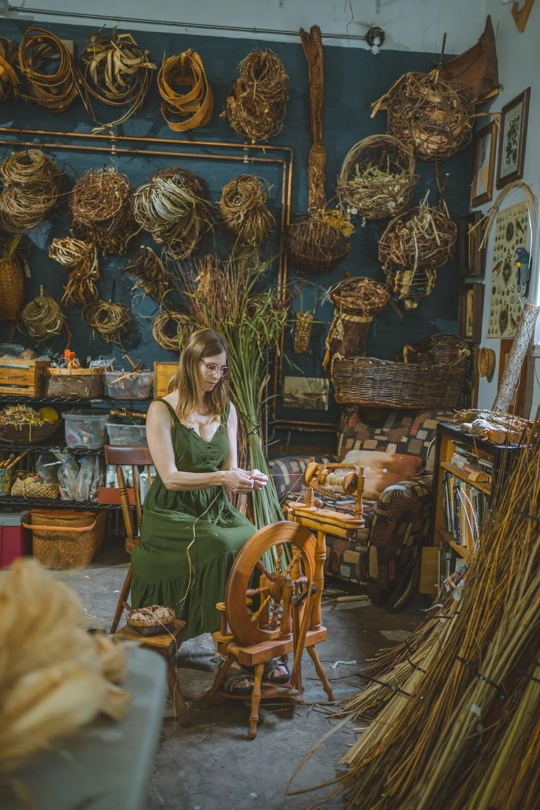 For Katie Grove, a wild basketry artist who's made Stone Ridge her home for fifteen years, this landscape is her studio, her material supplier, her teacher. The vines climbing through forests, the cattails growing in wetlands, the white pine bark and inner tree bark—these become functional vessels and sculptural works that can't be replicated by industrial means. Katie forages exclusively on private properties, works with arborists who provide materials that would otherwise be chipped, and follows a yearly cycle of knowing exactly when each plant is ready. White pine in spring, when sap flows. Vines in winter. Cattails and grasses in late summer and fall. This is basketry as ecological practice, as a relationship with land, as preservation of ancient knowledge.