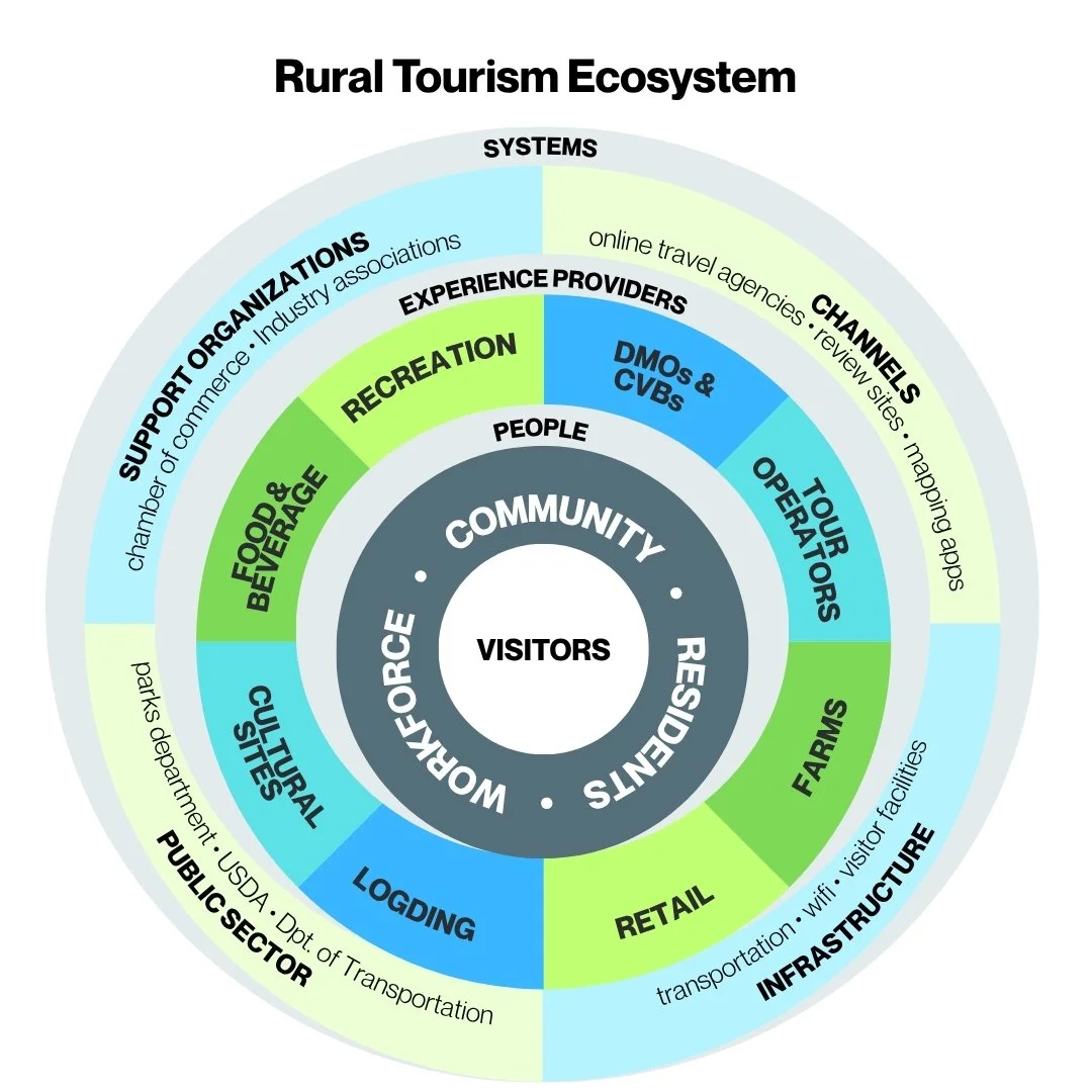 Rural tourism works best when every part of the ecosystem works together. At the center of every tourism experience is a visitor, whose journey is supported by the local community: residents and front‑line workers who host festivals, maintain trails, and decide whether tourism fits local values. Treating the community as co‑owners of the destination, not passive bystanders, is essential for sustainable tourism. Community input shapes priorities, residents help define which sites to promote, what infrastructure to build, and how to balance visitor needs with local traditions. When local residents guide decisions, tourism growth reflects shared goals, builds local trust, and ensures benefits reach the people who know the place best.